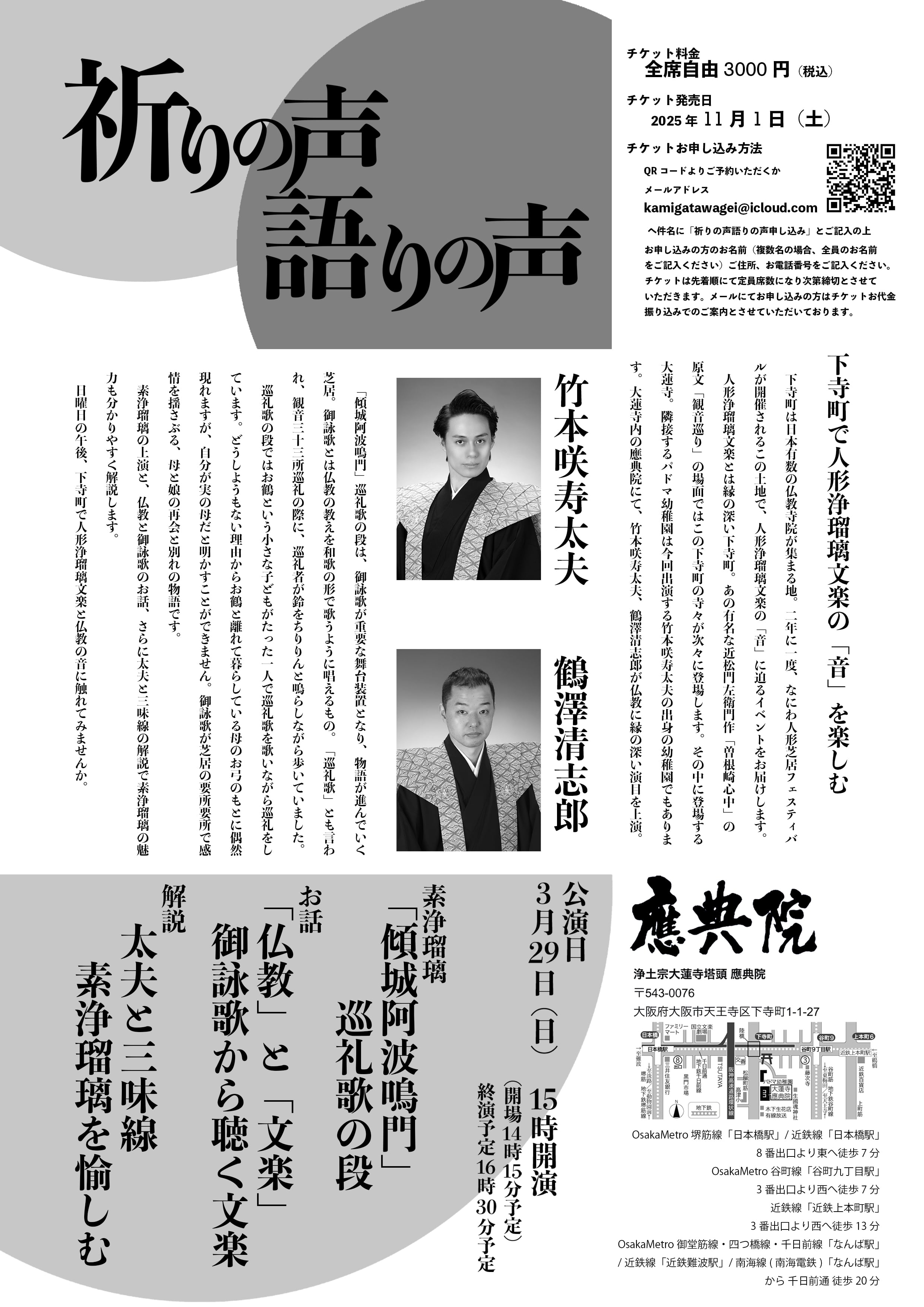 大蓮寺内の應典院にて、竹本咲寿太夫、鶴澤清志郎が仏教に縁の深い演目を上演。